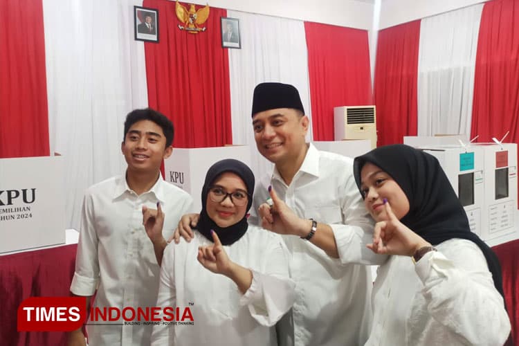 Diketahui Eri Cahyadi bersama keluarga mencoblos di TPS 04 Kelurahan Karah. Kedatangannya ke lokasi pemilihan diiringi dengan hadrah. (*)